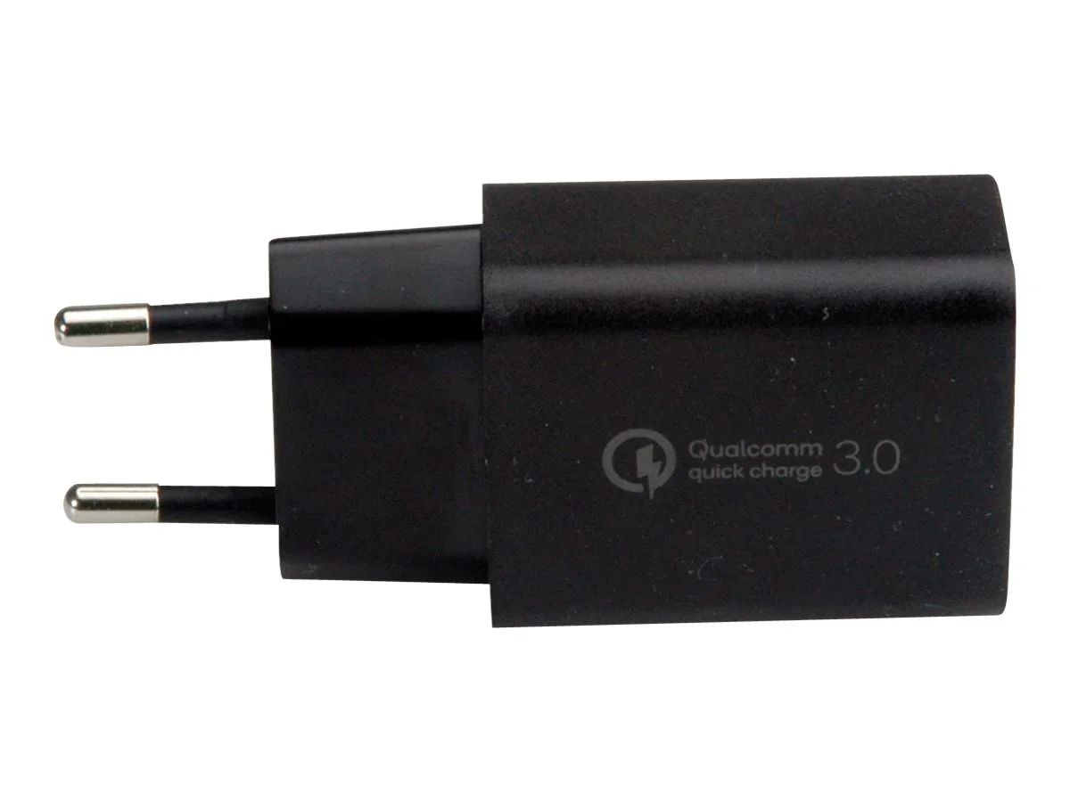 1-Port-USB-Ladegerät mit Unterstützung von Quick Charge 3.0 und mit maximal 18W für die Stromversorgung eines Smartphones/Tablets, einer externen SSD/HDD oder von anderen Geräten Zum Aufladen oder als Spannungsversorgung eines Geräts über dessen USB-Eingang Geeignet z.B. für Smartphone/Tablet, externe SSD/HDD oder andere Geräte Perfekte Ergänzung auch für Ihren Wireless Charger, da dort im Lieferumfang häufig keine Steckernetzteile enthalten sind Ladegerät mit einer USB Typ A Quick Charge 3.0 Buchse Mattschwarzes PVC-Gehäuse und Euroflachstecker Steckernetzteil mit einem USB Ausgang, Typ A Quick Charge 3.0 Buchse Eingangsspannung: 100 - 240V AC, 50 - 60Hz Ausgangsspannung: 3,6-6,5 V DC, 6,5-9 V DC, 9-12 V DC Ausgangsleistung: 18W (3A, 2A, 1,5A) Abmessung: 36 x 24 x 84 mm.