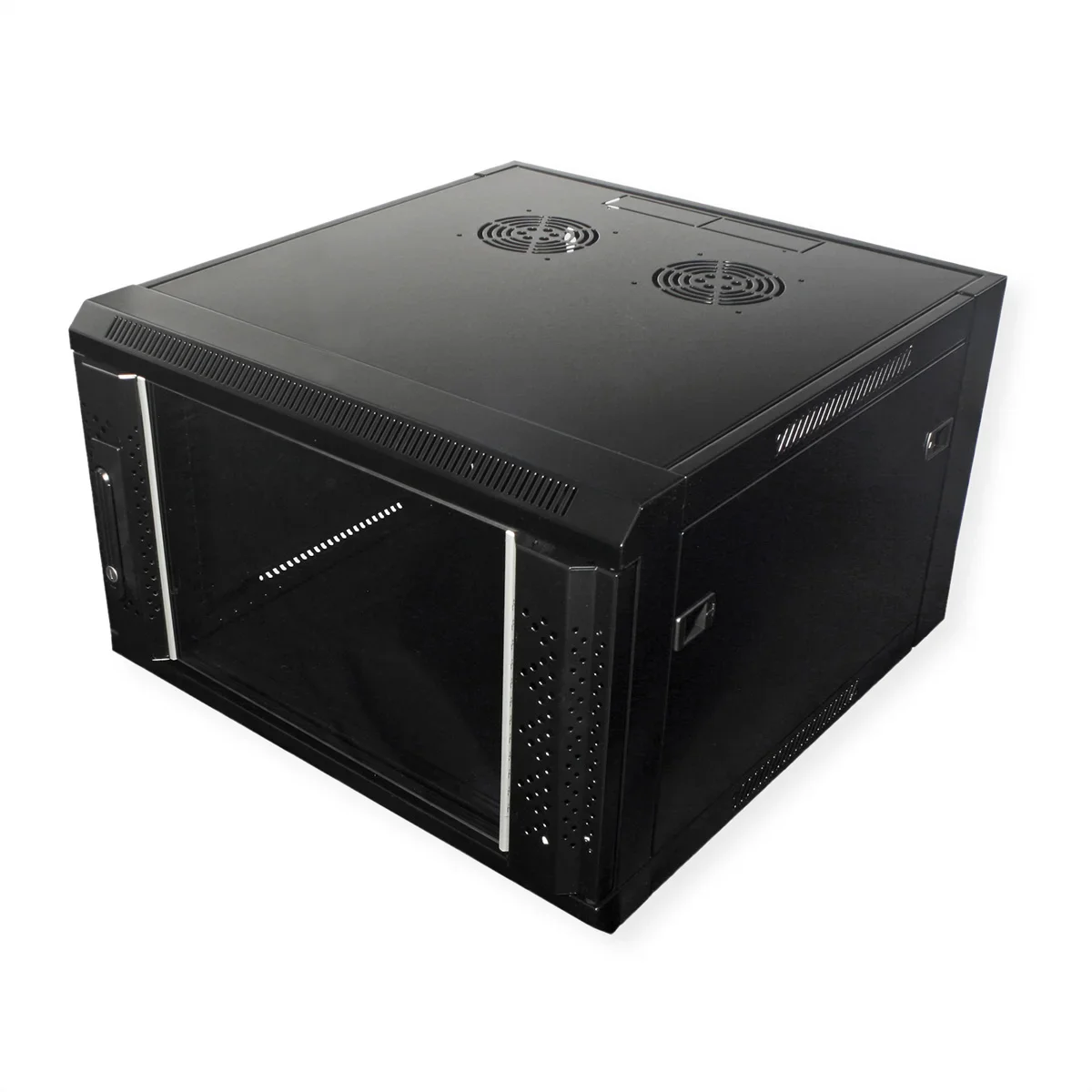 Die VALUE Wandgehäuse beweisen, dass solch praktische Lösungen auch attraktiv sein können. Die schwarzen, leicht glänzenden Gehäuse sind durchaus bürotauglich. Ein großzügiger Glaseinsatz in der Tür erlaubt auch bei geschlossener Tür freien Blick auf alle eingebauten aktiven und passiven Komponenten. Sowohl Tür als auch die Seitenwände können abgenommen werden, was optimalen Zugang ins Gehäuse-Innere ermöglicht; die Kabelzuführung kann von oben oder unten erfolgen. Die Tür der VALUE Wandgehäuse kommt mit abschließbarem Schwenkhebel.