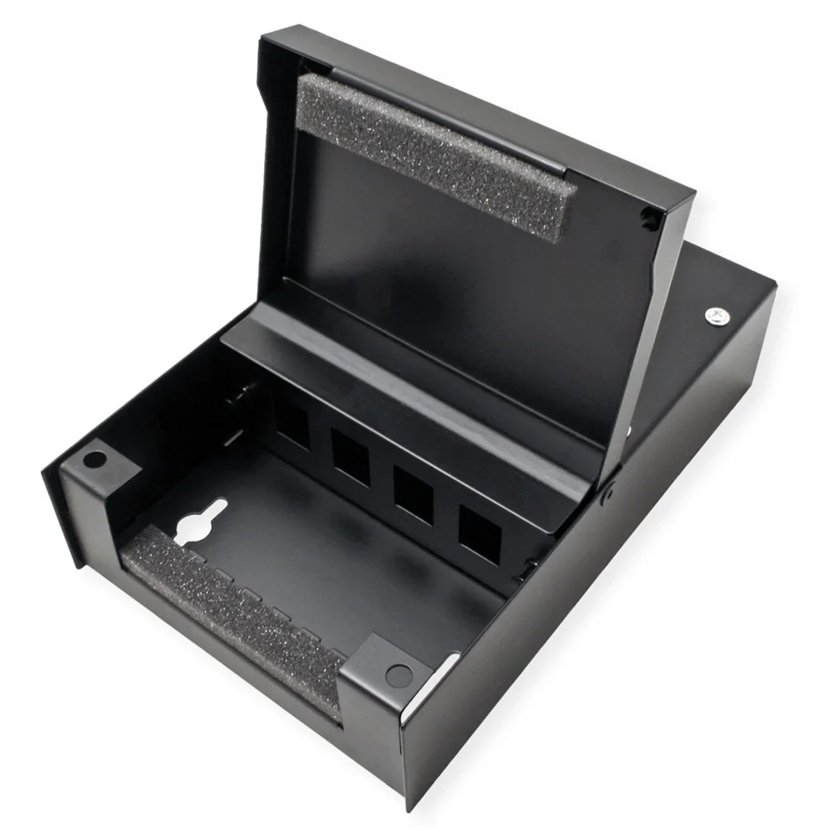Wandgehäuse mit 4 Ports für den Einsatz von Keystones und zum Verbinden von Kabeln. Für den Einsatz an Consolidation Points geeignet.