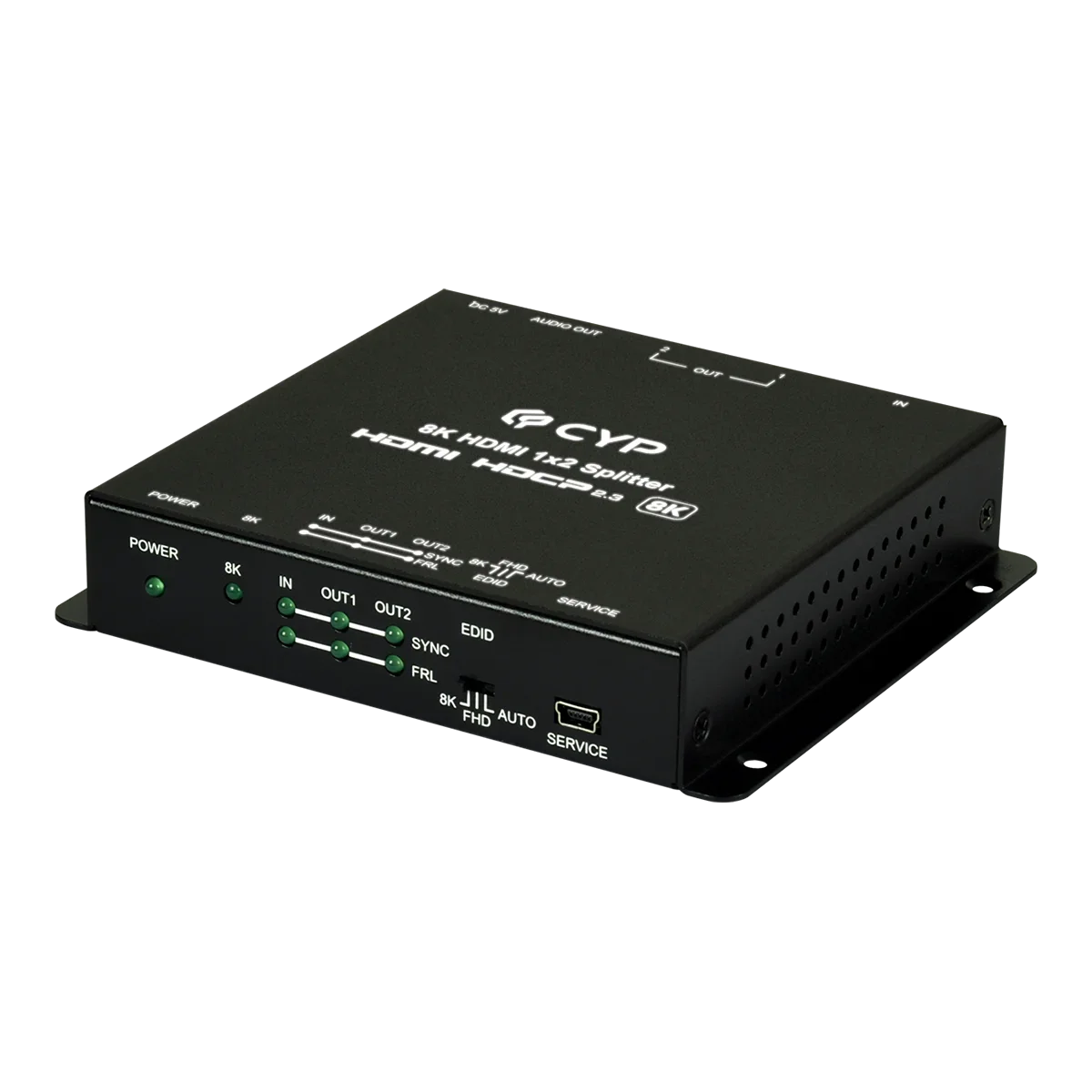 The new generation 8K 1 by 2 HDMI Splitter with HDCP 2.3 is an advanced solution for splitting a single HDMI input to 2 HDMI outputs. It provides high performance audio and video output through HDMI cables up to 8K@60Hz (YUV444) resolution as well as support for 16-bit Deep Color, HDR (High Dynamic Range), 3D content, HD audio and other features defined by HDMI 2.1 specification. It supports high resolution digital audio formats such as LPCM 7.1CH, Bit-Stream Audio, and audio sampling rate up to 192kHz. There are inputs and outputs indications on panel which will illuminate when detected, and system reset function allows the unit trigger TV to device’s HDMI input immediately.