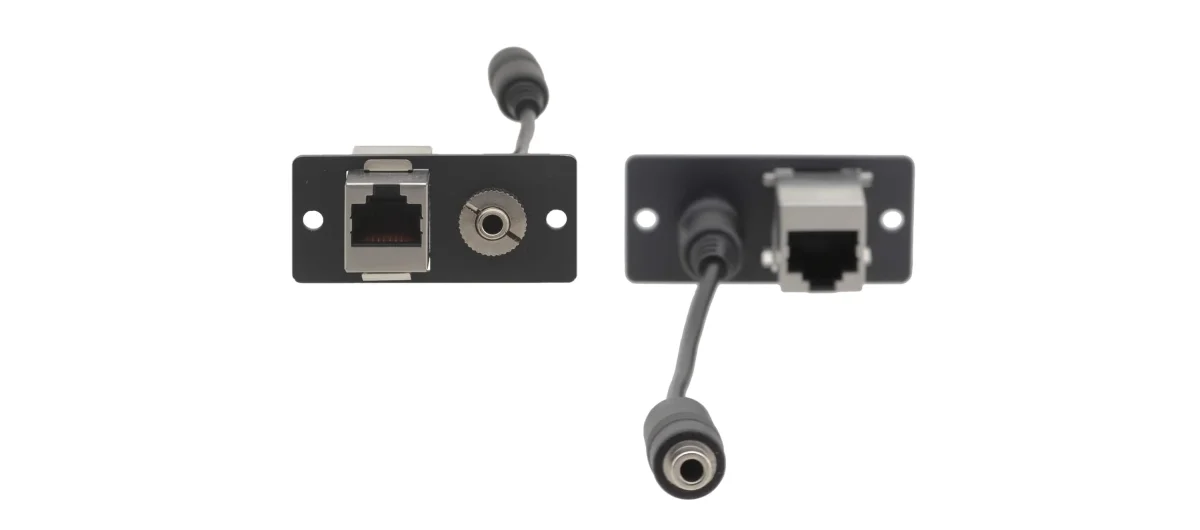 Wall−Plate Einsatz mit 1x RJ−45 Buchse und 3,5 mm Klinkenbuchse (vorn) und 1x RJ−45 Buchse und 1x 3,5 mm Buchse an ca. 10 cm Kabel (hinten)