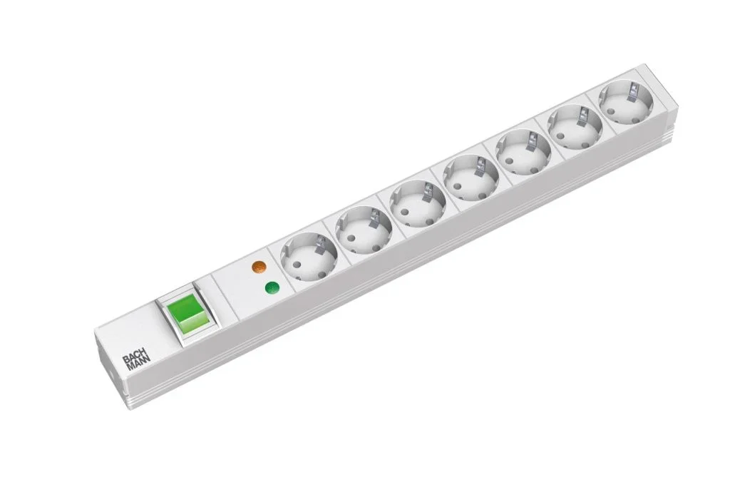 19" - Steckdosenleiste ALU 1HE 7-fach Schutzkontaktsteckdosen RAL 7035 mit Schalter grün und Überspannungsschutz 6,5kA ( ÜSS ) Profil: ALU 1HE Länge:438,5mm Endstücke genietet, nicht öffenbar 2m HO5VV-F 3G1,50mm² schwarz mit Schutzkontaktsteckdosen - Winkelstecker inkl. Befestigungswinkel mit Schrauben im Polybeutel